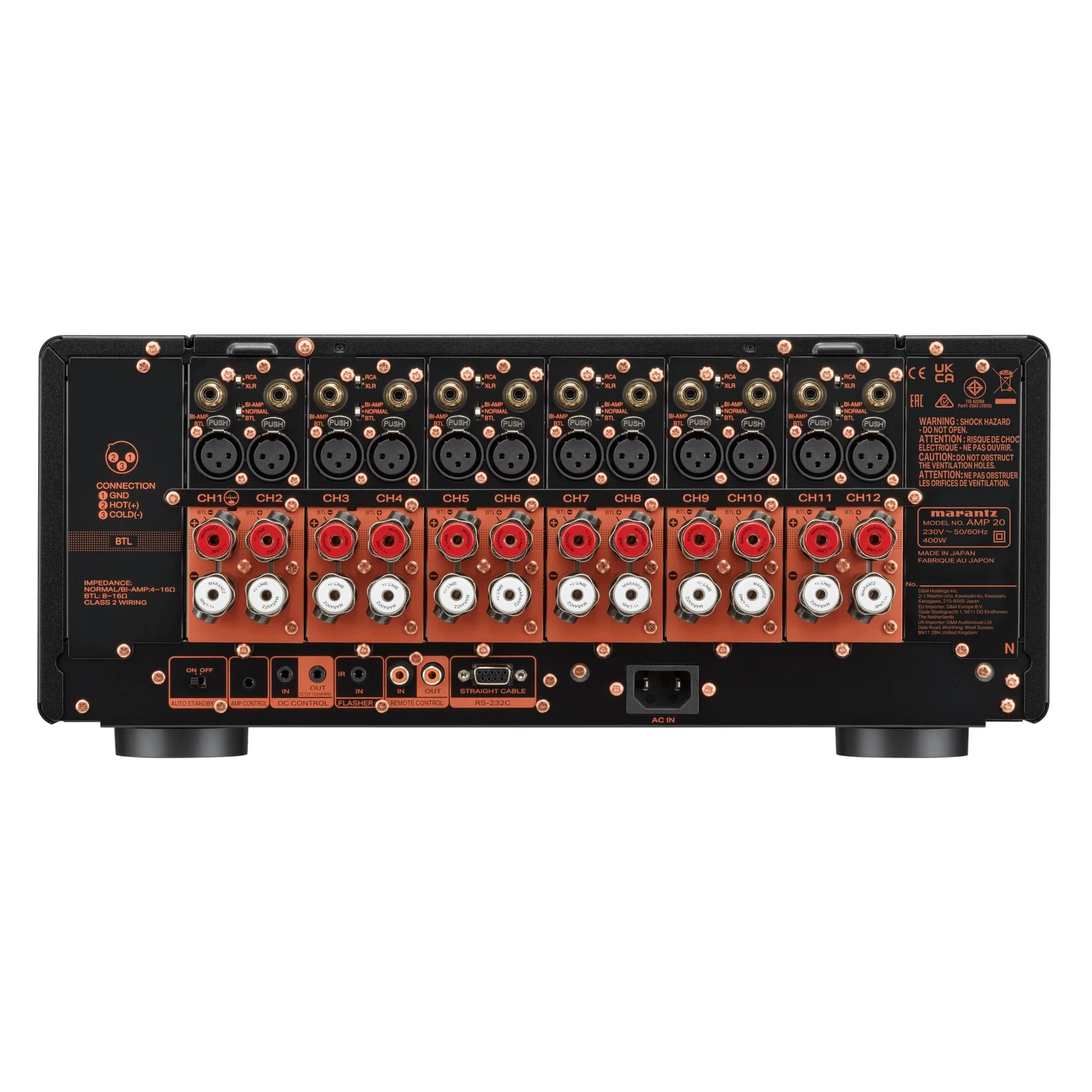 Marantz AMP 20 — 12-канальный усилитель мощности, разработанный для совместного использования с AV-процессором AV 20. Аппарат основан на высокоэффективной схеме, работающей в классе D, которая обеспечивает выходную мощность 200 Ватт на канал. Кроме этого в конструкции усилителя применена фирменная технология быстродействующих звуковых модулей HDAM-SA2 и массивный трансформатор в блоке питания. Для подключения доступны как RCA, так и симметричные входы XLR.