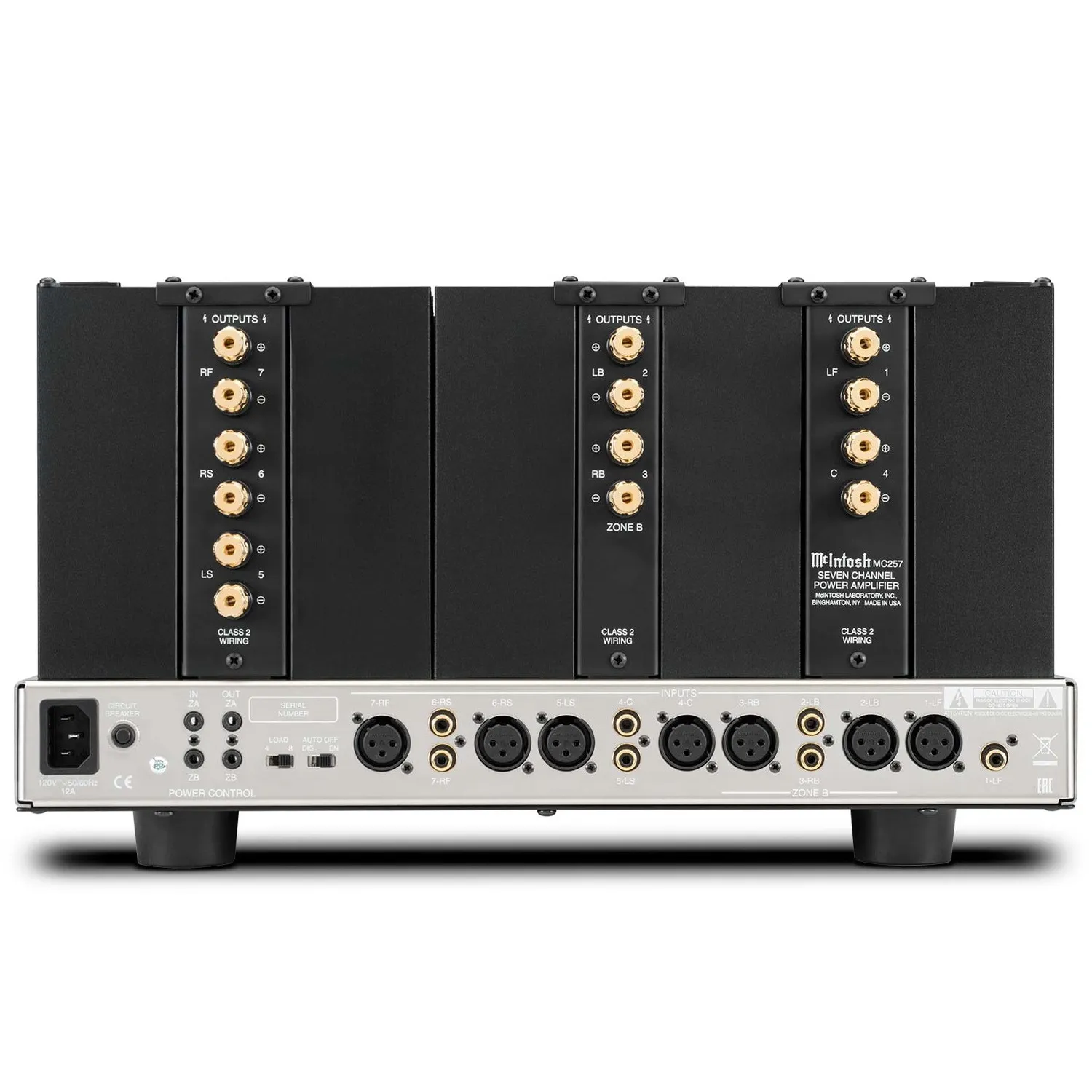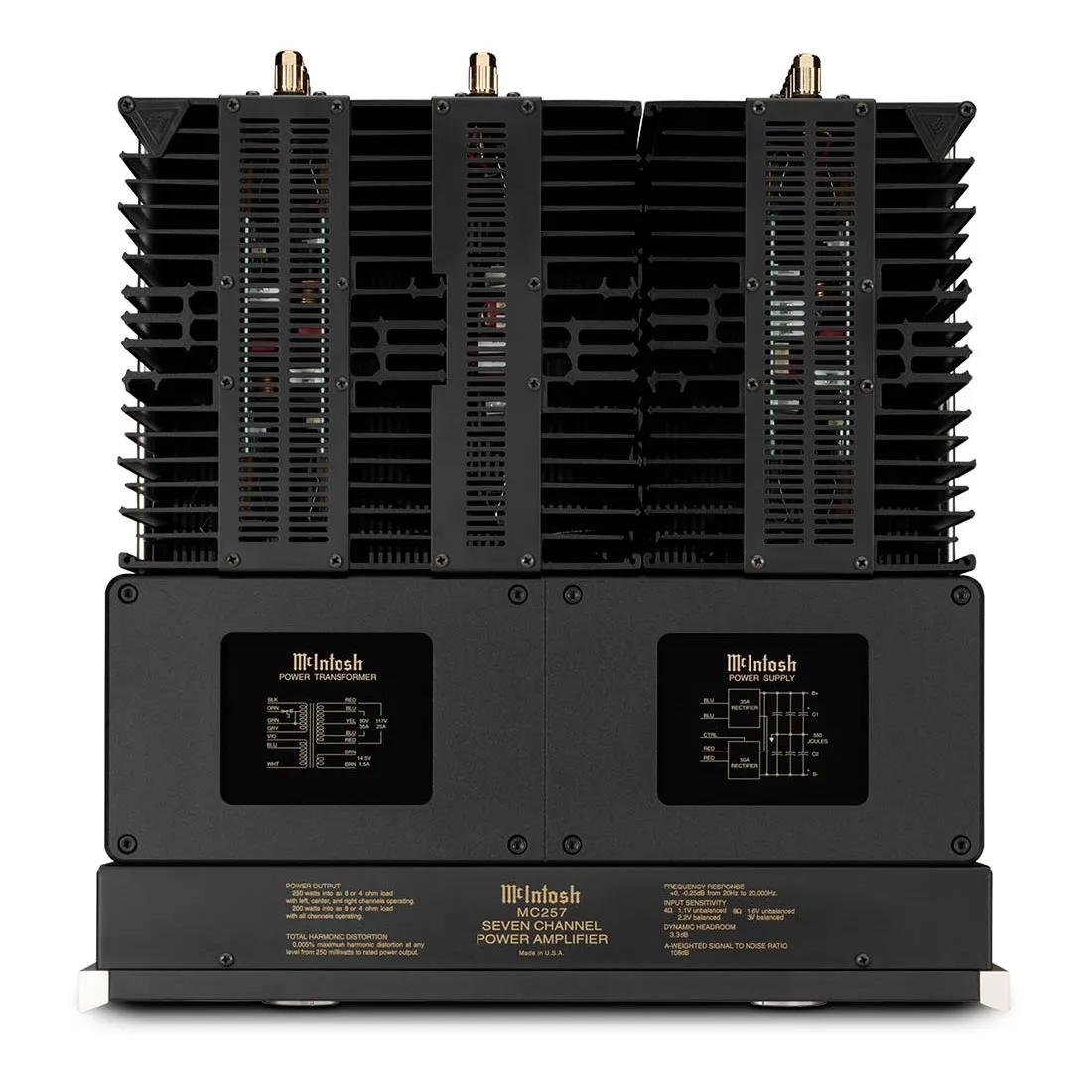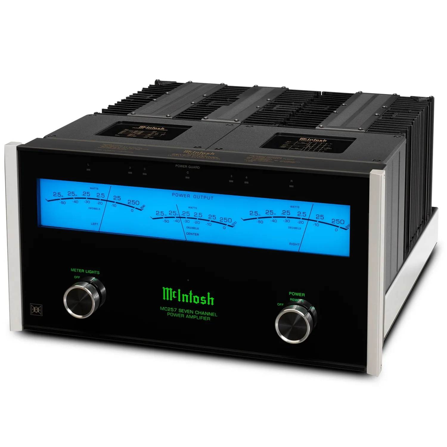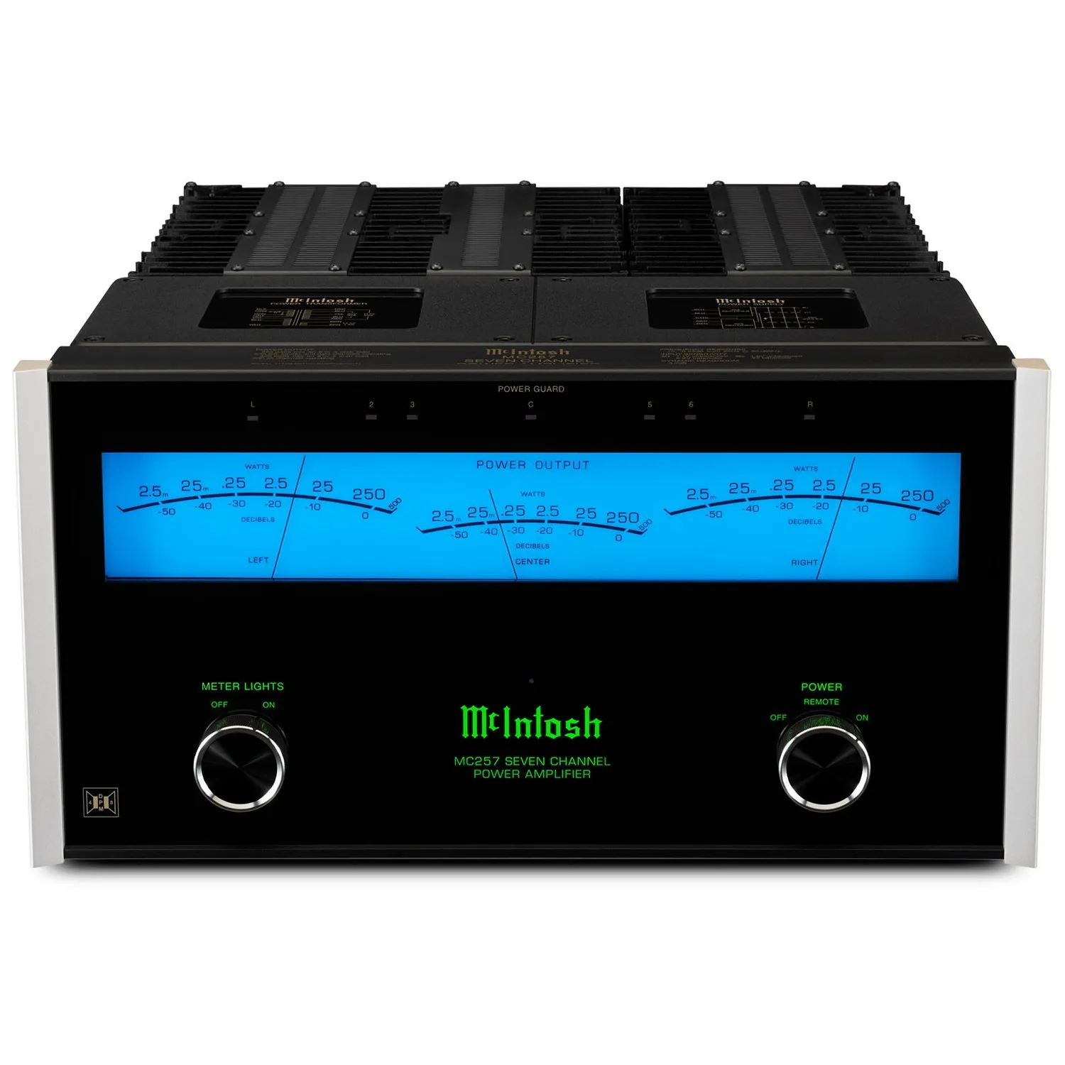 McIntosh MC257 — семиканальный усилитель мощности для систем домашнего кинотеатра. Аппарат имеет массивный блок питания с фирменной технологией Dynamic Power Manager, позволяющей обеспечивать заявленную мощность вне зависимости от подключенной нагрузки. Оригинальный стиль модели подчеркивает узнаваемый стрелочный индикатор TripleView и боковые теплоотводящие радиаторы Monogrammed Heatsinks. Для подключения к предварительному усилителю или AV-процессору предусмотрены RCA и XLR входы.
